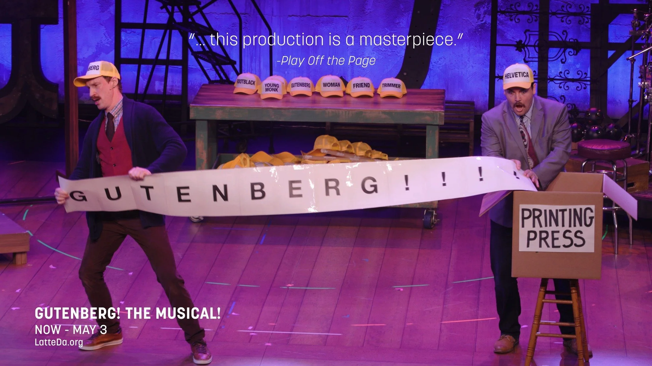 Fresh off its hit Broadway premiere, Gutenberg! The Musical! is a clever, offbeat, frequently absurd comedy that affectionately spoofs the world of musical theater. This love letter to new works is told through the lens of two aspiring writers earnestly pitching their wildly inaccurate musical about the invention of the printing press, blending infectious enthusiasm, witty songs, and irreverent historical twists. Twin Cities theater luminary Tyler Michaels King returns to Latté Da, this time wearing the (trucker) hat of Director. Equal parts satire and celebration, Gutenberg! is a fast-paced theatrical romp that revels in the art of making something out of nothing—one song and one dream at a time.
